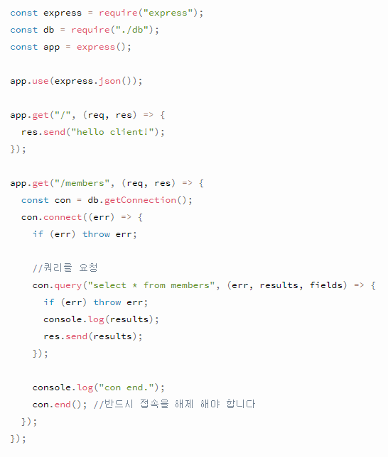 쿼리 및 db 사용이 끝나면 반드시 커넥션을 end()해야 한다.