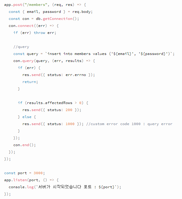 에러가 없다면, mysql 커넥션을 통해 쿼리를 요청한다.