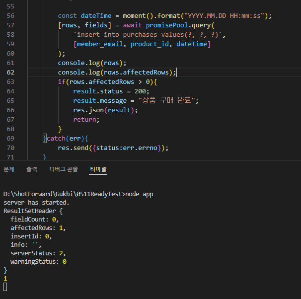 객체라면 rows.affectedRows 식으로 해야 한다.