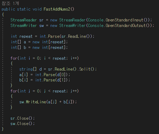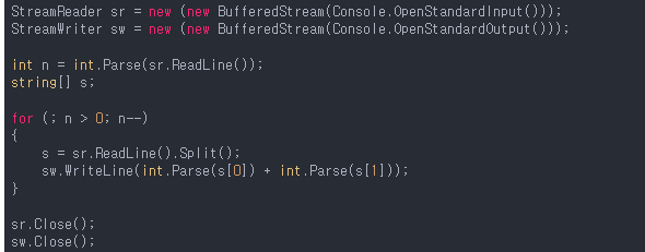 이 문제에서 익혀야 하는 것은 단순히 A+B를 반복하는 방법이 아니라 최대한 입출력을 빠르게 하는 방법이다. 별로 어렵지 않기 때문에 추후 입출력이 많은 문제가 나올 때마다 써먹으면 큰 도움