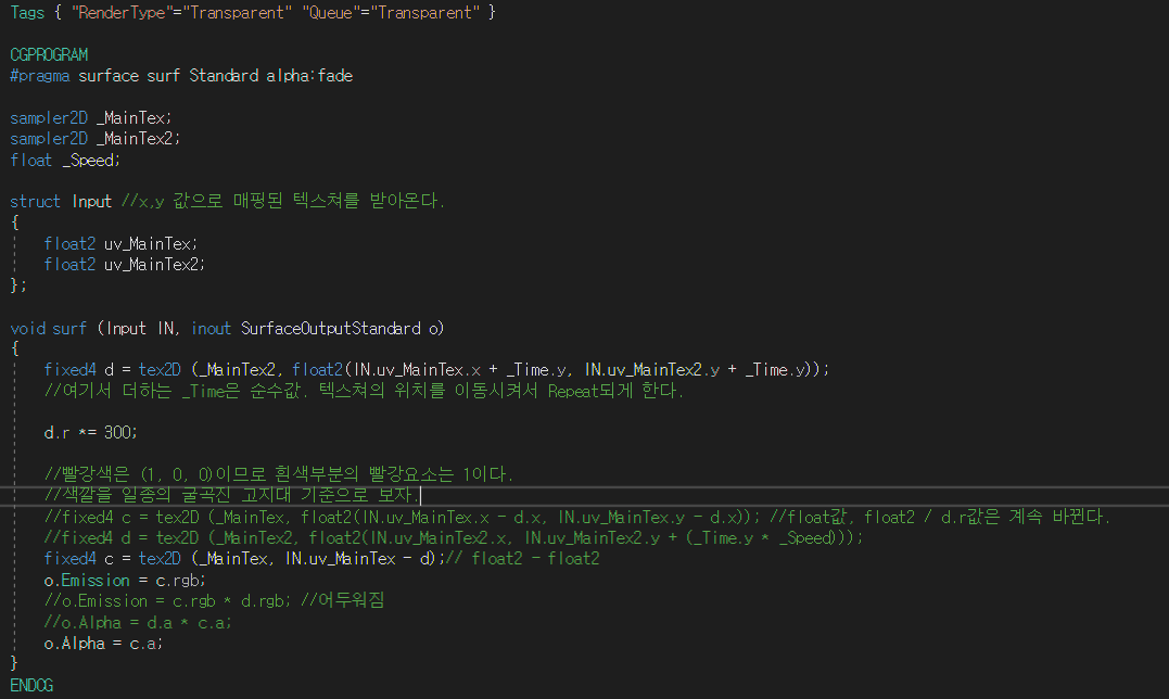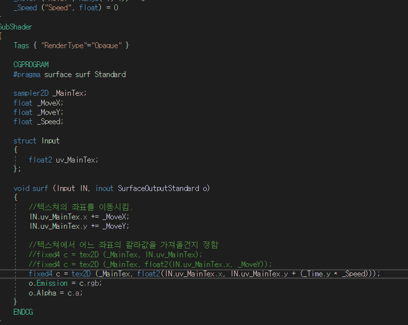 시간을 tex2D함수의 텍스쳐 좌표의 칼라를 가져오는 식에 더해서 텍스쳐 애니메이션을 만들 수 있다.