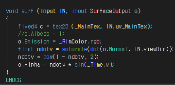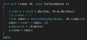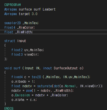 특징은 Input 구조체에서 viewDir 시선 방향 벡터를 받아와서 노말 벡터와 내적한다는 것이다.