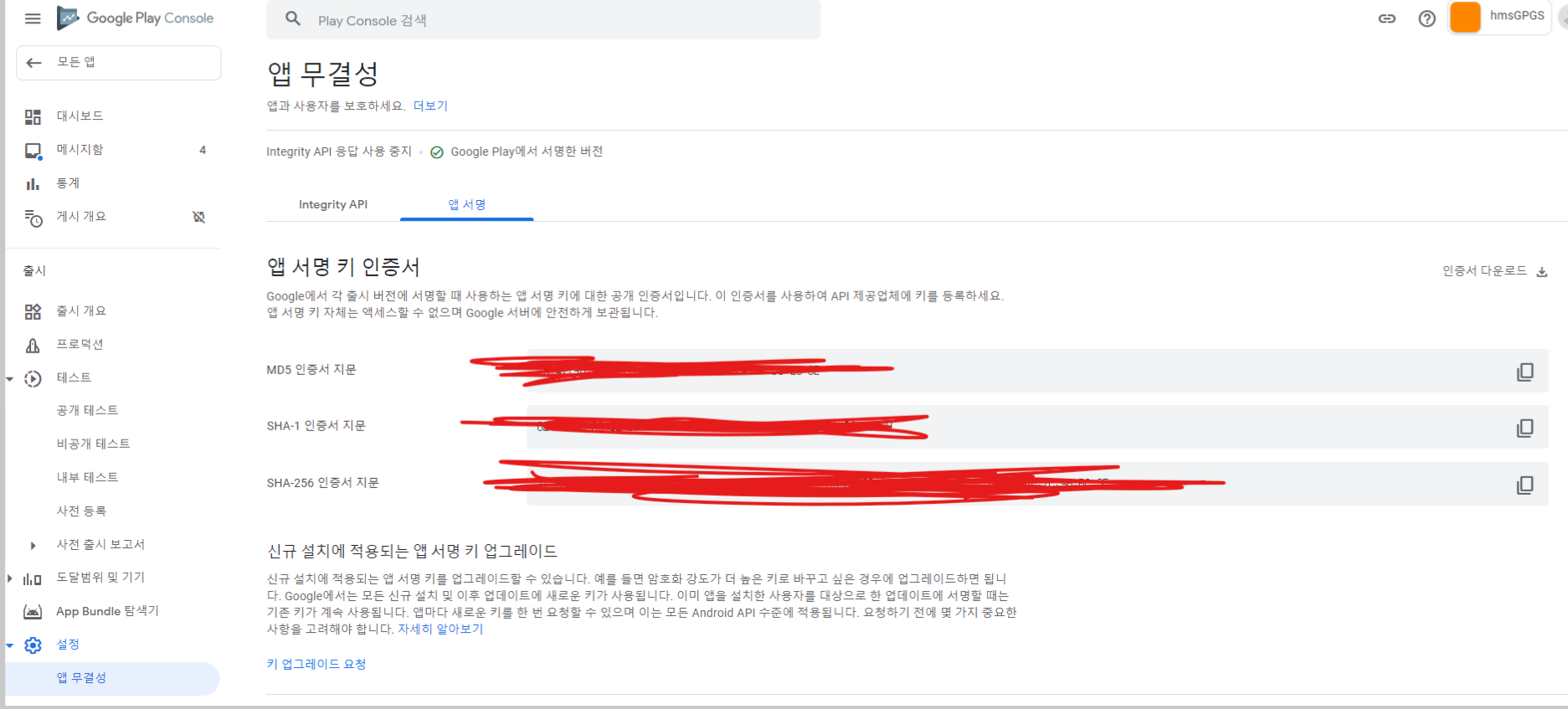 1. 구글 플레이 콘솔에서 설정 -> 앱 무결성 이동